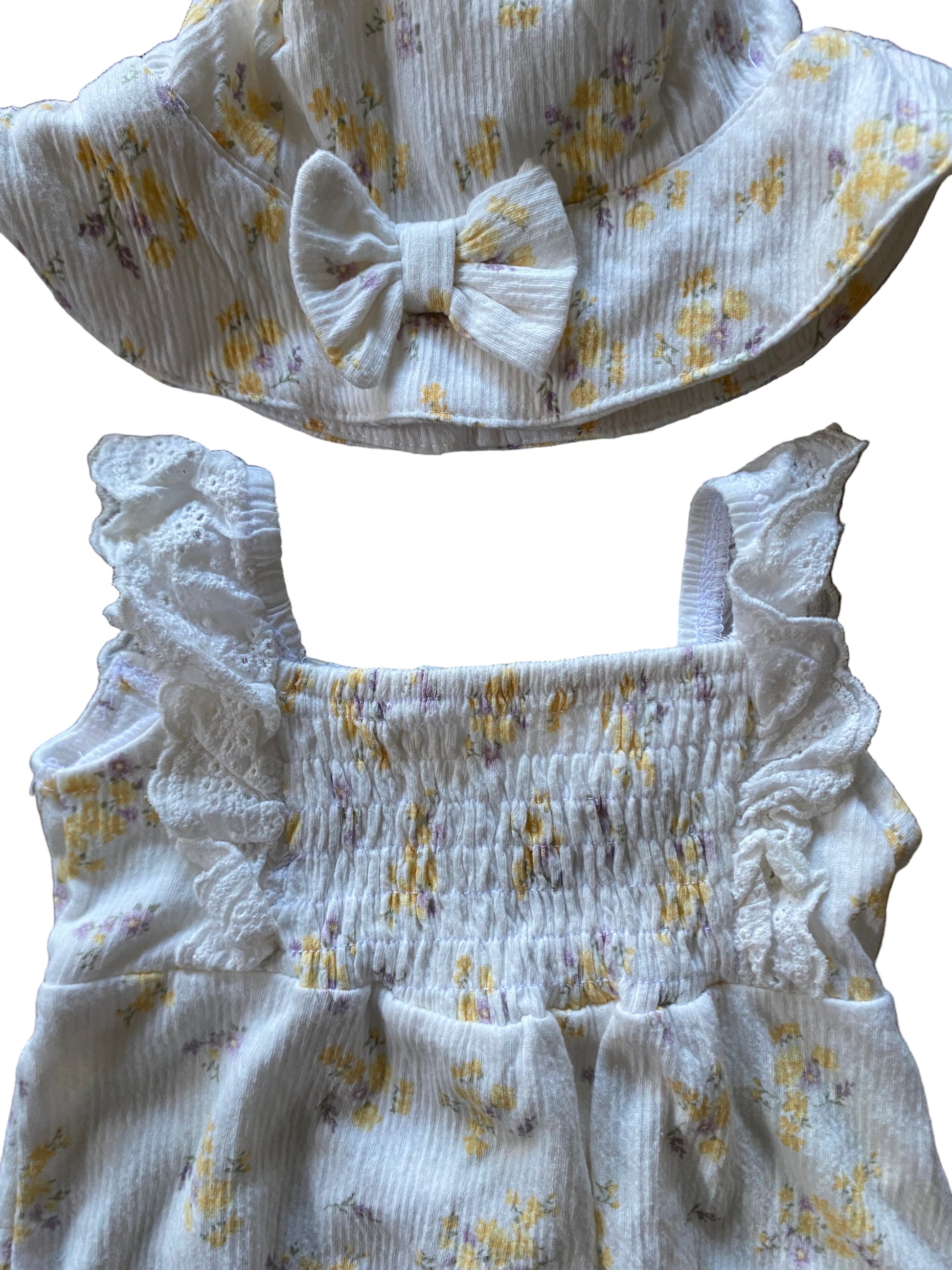 Nicole Miller | White and Yellow Bubble Romper with Sun Hat | 0-3